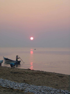Fisherman bringing the nights catch in at sunrise in Senga Bay, Lake Malawi