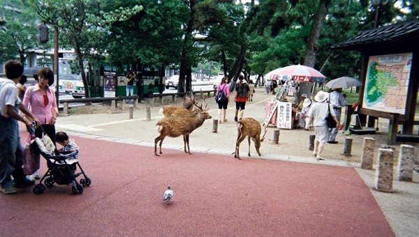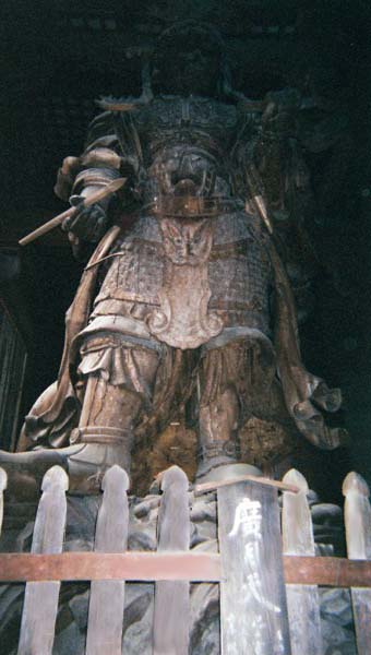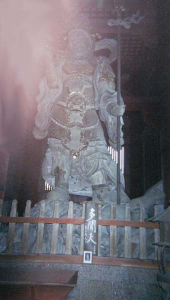 Nara The ancient capital of Japan (710 A.D.). Best mix of history & scenary I saw. The pictures below are mostly of Todai-ji temple, largest wooden structure in the world. The large wooden statues it houses were tough to photograph due to there size and the poor lighting. Unfortunately, the pictures of the giant Budha (15 m. high) didn't come out. Maybe I'll have a better flash next time. Picture Highlights These dear roam freely...a little strange for such a big city...